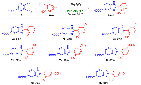 Possibly looking forward to developing and testing novel donepezil-hybrids, we decided to broaden already at this stage the scope of the aforementioned cyclodehydration reaction using ChCl/gly as a privileged reaction medium. The functionalization of the phenolic acid component may indeed contribute to modify the biological properties of the corresponding adducts, thereby tuning their chelating properties for the treatment of AD. In line with this strategy, Liang et al. recently synthesized a series of novel halogenated 8-hydroxyquinolines as derivatives of Clioquinol (CQ), which is a well-known prototypical metal-chelating drug [68]. CQ was studied up to phase II clinical trial with promising results, but it was later discontinued because of issues encountered during the development of the industrial production process [2,75]. In particular, it was noticed that the introduction in the CQ structure of powerful electron-withdrawing groups led to an improved metal-chelating activity [68]. Another research group recently explored also the potentiality of these substituted nuclei as antioxidant agents [76]. To our delight, by reacting a variety of salicylaldehyde derivatives 6b–h, decorated with electron-donating and electron-withdrawing substituents, with 5, the desired 2-hydroxyphenylbenzimidazole derivatives 7b–h could be smoothly synthesized in 72–97% yield within 30 min reaction tim at 50 °C (Figure 2). Of note, using DMA as the reaction medium, the above adducts have been reported to be prepared in 51–74% yield after 12 h reaction time at 100 °C [77]. The synthesis of 1,2-disubstituted or 2-substituted benzimidazoles has also been recently achieved using o-phenylenediamine (o-PDA) both as a component of the eutectic mixture ChCl/o-PDA (1:1 mol mol−1) and as a reagent in combination with different aldehydes [78].