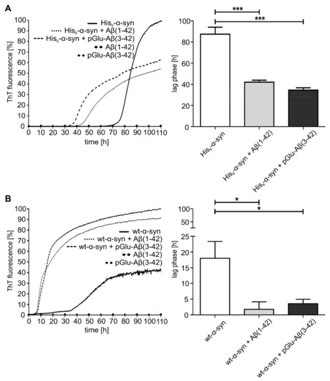 Kinetics of His6-α-synuclein and wt-α-synuclein fibril formation and corresponding statistics of lag phase. Fibril formation was induced by incubation of either His6-α-synuclein (A) or wt-α-synuclein (B) assessed by ThT fluorescence at pH 7.0. Seventy-five micromolar of His6-α-synuclein or 55 µM wt-α-synuclein were either incubated alone (solid) or in combination with 1 µM Aβ(1–42) (dotted) or 1 µM pGlu-Aβ(3–42) (dashed). Fluorescence intensities of Aβ-peptides alone are visualized as dots. The corresponding statistical analysis of the lag phases was performed as described above (mean ± SD, n = 6, * p ≤ 0.05 and *** p ≤ 0.001, one-way ANOVA and Tukey post-hoc analysis).