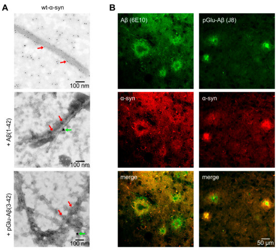 Co-aggregation of wt-α-synuclein with Aβ(1–42) and pGlu-Aβ(3–42) in vitro and in vivo. (A) TEM images of amyloid fibrils of wt-α-synuclein alone (top) or in combination with Aβ(1–42) (middle) or pGlu-Aβ(3–42) (bottom). Fibrils were labeled with immunogold particles of defined sizes to identify the different peptides: 5 nm gold particles for the α-synuclein peptides (red arrows) and 20 nm gold particles for the Aβ peptides (green arrows). (B) Double immunofluorescent labeling of Aβ (green) and α-synuclein (red) in the parietal cortex of Tg2576 mouse brain. The respective peptides were labeled with mouse monoclonal antibody 6E10 directed against the amino terminus of the Aβ peptide, the pGlu-Aβ-specific mouse monoclonal antibody J8, and the rabbit anti-phospho-Serin129-α-synuclein antibody ab51253, specific for aggregated α-synuclein.