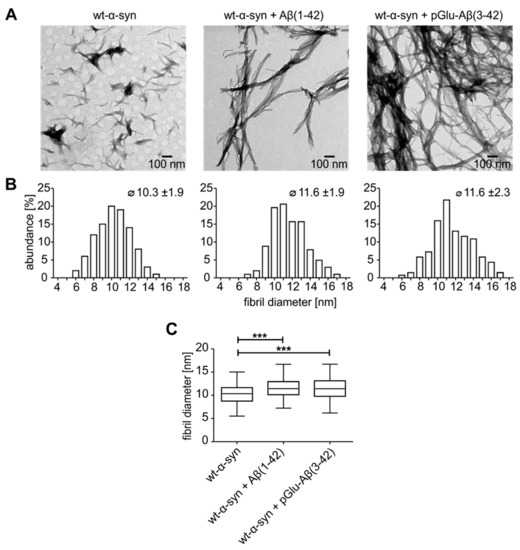 Analysis of amyloid fibrils formed from wt-α-synuclein (75 µM) alone or in the presence of Aβ(1–42) or pGlu-Aβ(3–42) (1 µM). (A) Negative stained TEM images and (B) corresponding histograms, mean value and standard deviation of fibril diameter quantifications from the above TEM images (n = 100). (C) Corresponding statistics of fibril diameter (mean ± SD, n = 100, *** p ≤ 0.001, one-way ANOVA followed by Tukey post-hoc analysis).
