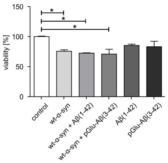 To study the toxicity of wt-α-synuclein and co-aggregates of wt-α-synuclein and Aβ(1–42) or pGlu-Aβ(3–42), an MTT assay was performed using primary neurons from whole mouse brains. The optimal α-synuclein concentration was obtained from concentration-dependent kinetics of fibril formation of wt-α-synuclein at 20–100 µM (Figure 2). No significant cytotoxic potential of 1 µM Aβ(1–42) or pGlu-Aβ(3–42) was observed, which is in accordance with previous studies [30]. However, wt-α-synuclein, as well as co-aggregates of wt-α-synuclein and Aβ(1–42) or pGlu-Aβ(3–42), reduced cell viability significantly at an average to 73% (wt-α-synuclein: 75.8%, wt-α-synuclein with Aβ(1–42): 72.5%, wt-α-synuclein with pGlu-Aβ(3–42): 70.9%) of that of the vehicle control (Figure 6).
