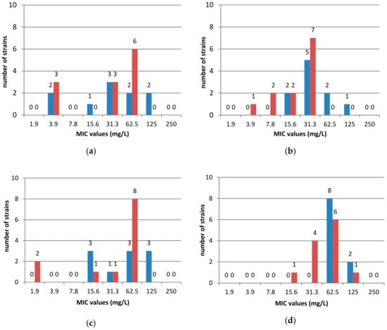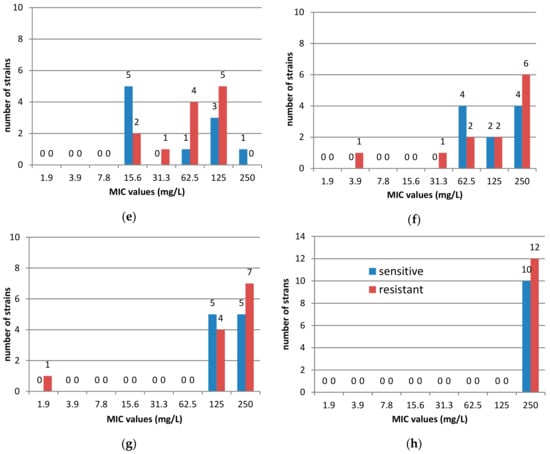 Susceptibility of 22 clinical H. pylori strains to essential oils in MIC values (mg/L): (a) cedarwood oil; (b) oregano oil; (c) thyme oil; (d) lemongrass oil; (e) lemon balm oil; (f) tea tree oil; (g) lemon oil; (h) pine and fir oils.