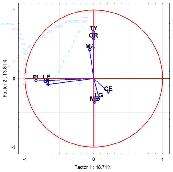 Principal component analysis of 9 analyzed essential oils based on their chemical composition. PI—pine needle EO; LE—lemon EO; SF—silver fir EO; TY—thyme EO; LG—lemongrass EO; CE—cedarwood EO; ME—lemon balm EO; MA—tea tree EO; OR—oregano EO.