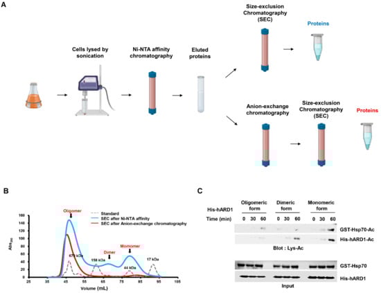 To investigate the reason underlying the instability of the lysine acetylation activity of ARD1 in vitro, we purified and analyzed the oligomeric state of rhARD1/NAA10 with size-exclusion chromatography (Figure 2A). We evaluated the change in the oligomeric state of hARD1/NAA10 in response to the purification process by collecting it at different steps and comparing the oligomeric states. rhARD1/NAA10 was collected after its elution from Ni-NTA affinity column and again after the anion-exchange step, the final step of purification. The size-exclusion chromatography profile of the eluted protein from Ni-NTA column revealed its various oligomeric states, including monomeric, dimeric, and high oligomeric forms (Figure 2B). After anion-exchange purification, size-exclusion chromatography showed that rhARD1/NAA10 mainly existed in a high oligomeric state and had only a few monomers (Figure 2B). These results indicate that the proportion of the monomeric form of rhARD1/NAA10 after affinity purification was higher than that after anion-exchange purification, possibly explaining the neglected acetyltransferase activity of rhARD1/NAA10 in vitro after dialysis.