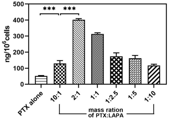 Intracellular paclitaxel content after incubation of the free drug (paclitaxel vs. paclitaxel plus lapatinib at different ratios) for 4 h in MCF-7/ADR cells (n = 3, mean ± SD, *** p < 0.001).