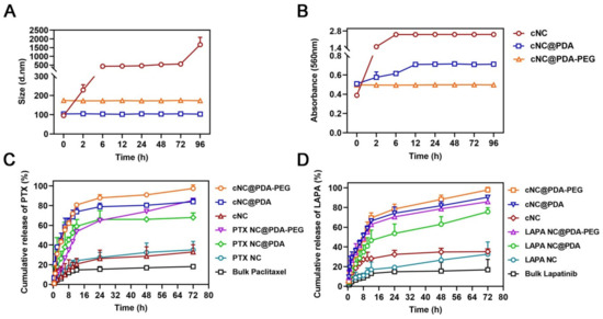 The particle size change of different composite nanocrystals in PBS during storage (Figure 4A) was measured by DLS, and the particle aggregation of different composite nanocrystals in PBS and 10% FBS was evaluated by absorbance at 560 nm (Figure S3 and Figure 4B). The results showed that cNC aggregated quickly in PBS and 10% FBS, while cNC@PDA and cNC@PDA-PEG were stable in both media for a long time. The release of PTX from cNC@PDA-PEG was the fastest and that from bulk paclitaxel was the slowest. The cumulative release of PTX and LAPA from cNC@PDA-PEG reached 97.41% and 97.84% at 72 h, respectively, while both were less than 40% in cNC and the bulk drug. The release from cNC and the bulk drug was the slowest because they both precipitated and clumped in the dialysis bag. Moreover, the release performance of PTX from cNC and PTX NC was similar, indicating that the additional LAPA had little effect on the release performance of PTX in cNC.