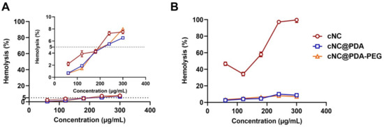 Hemolysis induced by cNC, cNC@PDA and cNC@PDA-PEG: (A) 2 h; (B) 6 h (n = 3, mean ± SD).