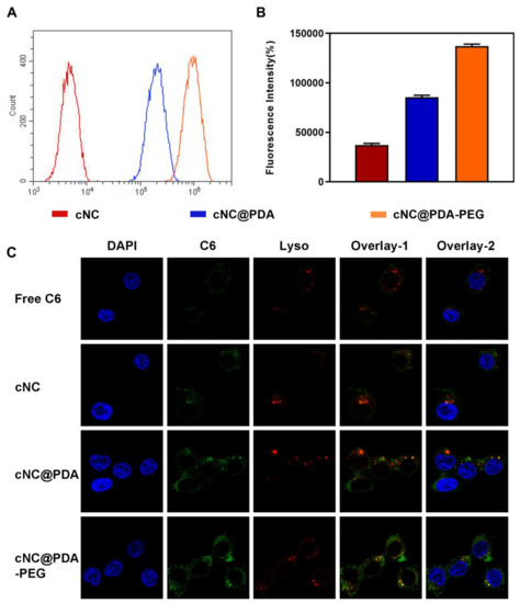 For flow cytometry (FCM), MCF-7/ADR cells were similarly seeded in 6-well plates and co-incubated with C6-labeled cNC, cNC@PDA and cNC@PDA-PEG, except that the final concentration of C6 equivalent was 10 nM. After incubation for 4 h, the medium was removed and the cells were washed with PBS twice to wash away unbound composite nanocrystals. The cells were then collected by centrifugation at 1000 rpm and resuspended in PBS. The fluorescence labeled cells were counted by a flow cytometer BD FACSCalibur Flow Cytometry System (Applied Cytometry Systems, NJ, USA) at Ex 466 nm and Em 504 nm.