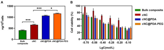 Cytotoxicity was evaluated at different concentrations of bulk PTX, bulk LAPA, bulk composite and cNC. The results showed that the cNC showed stronger anti-proliferative activity (Figure 6A), which might benefit from the fact that the cNC contributes to the co-delivery of drugs and was more conducive to the destruction of drug resistance. Cellular uptake of different composite nanocrystals was tested with MCF-7/ADR cells. More cNC@PDA-PEG was taken up than cNC and cNC@PDA (Figure 6B), perhaps benefiting from its better stability.