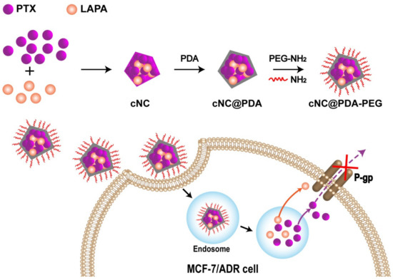 Illustration of the treatment of multidrug-resistant cancer with the cNC@PDA-PEG. PTX: paclitaxel; LAPA: lapatinib; cNC: composite nanocrystals; PDA: polydopamine; PEG: Polyethylene glycol.