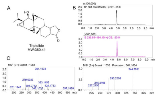 The structure and mass spectra of triptolide. (A) The structural formula of triptolide. (B) Extracted ion chromatogram (EIC) spectra of triptolide and the internal standard (internal standard (IS), carbamazepine). (C) The MS1 and MS2 mass spectra of triptolide acquired by LC/MSn-IT-TOF.