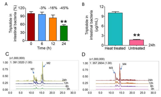 Triptolide could be metabolized in the gut microbiota. (A) The level of triptolide decreased during incubation with rat intestinal bacteria after 0 h, 6 h, 12 h, and 24 h. (B) Intestinal bacteria mainly participated in the metabolism of triptolide by comparison between untreated and heat-inactivated intestinal contents. (C) The extracted ion chromatograms (EICs) showed that the levels of the possible metabolites M1 and M2 increased with increasing time. (D) The EICs showed that the levels of possible metabolites M3 and M4 increased with increasing time. Data are presented as mean ± SD, and two-tailed Student’s t test were used for analysis (** p < 0.01).