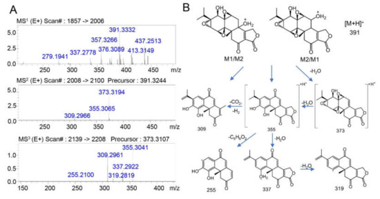 The possible structures of M1 and M2 and the spectra of the MSn fragments are shown in Figure 3A,B. Both M1 and M2 exhibited an ion of m/z = 391 as their [M + H]+ ions, and the retention times were 11.5 min and 15.7 min, respectively. According to the fragmentation of triptolide, the structures of the generated fragments were proposed as follows: the ions of m/z 373 and 355 were produced with a loss of H2O (−18, m/z 373) or 2 H2O (−36, m/z 355). Then, fragments with a further loss of H2O (−18, m/z 337), 2 H2O (−18, m/z 319), CO2H2 (−46, m/z 309), or C5H8O2 (−100, m/z 255) were possibly generated, as shown in Figure 3A. Based on the possible metabolic pathways, molecular weights, and mass spectral cleavage pathways, M1 and M2 were proposed to be monohydroxy-carbonylated metabolites of triptolide, which was consistent with the reported metabolite in urine [8,16].