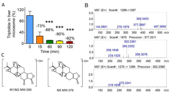 The metabolites of triptolide in liver microsomes. (A) The level of triptolide incubated with rat liver microsomes at different time points (0 min, 15 min, 60 min, 90 min, and 120 min). (B) The MSn data of the triptolide metabolite M5 (molecular weight: 376) in liver microsomes. (C) The possible structure of the triptolide metabolites M1/M2 and M5 in rat liver microsomes. Data are presented as mean ± SD, and two-tailed Student’s t test were used for analysis (*** p < 0.001).
