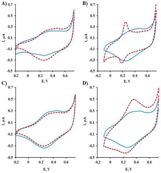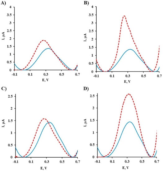 - The spontaneous self-assembly of 0.01 mM AHT and 1 mM MBL layer formation—3 h, room temperature (RT), DCM: MeOH (1:1, v/v); the electrodes were immersed in tubes containing 180 µL of modifying solution; after modification electrodes were carefully rinsed with a mixture of DCM: MeOH