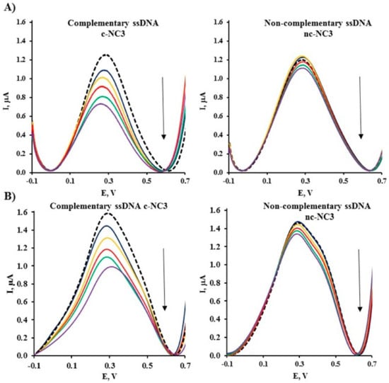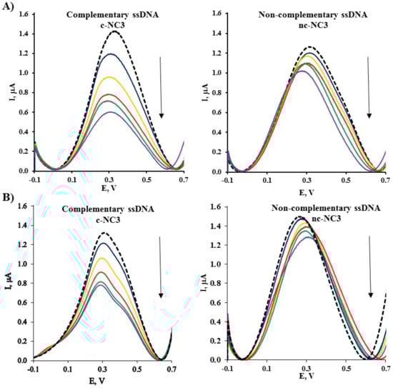 All systems studied were selective. The non-complementary ssDNA (nc-NC3) generated only negligible responses (Figure 3 and Figure 4). The selectivity was calculated based on the slope ratio as recommended by Wang and Umezawa [,], Equation (2):
