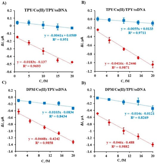 Cyclic voltammetry at different scan rates was performed for the electrodes modified with TPY-M(II)-TPY-EA and TPY-M(II)-TPY-ssDNA. The linear relationship of reduction and oxidation current vs. scan rate confirms the presence of Co(II) and Cu(II) centers on the surface of the gold electrodes (Figures S3 and S4). The slope of the cathodic peak current obtained for TPY-Co(II)-TPY-ssDNA was larger than the slope recorded for TPY-Co(II)-TPY-EA (Figure S3B,D). The same tendency was observed for Cu(II) SAMs. However, the values of the slopes were substantially smaller than those obtained for Co(II) SAMs (Figure S4B,D).