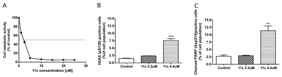 Influence of 11c on HL-60 cells after 24 h incubation (A): Metabolic activity, (B): DNA damage measured by H2AX phosphorylation changes and (C): apoptosis induction measured by PARP cleavage. (B,C): Results are expressed as mean ± SEM of a triplicate assay; *** p < 0.001, ** p < 0.01.
