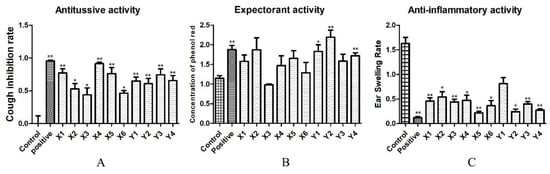 Yang, L.; Jiang, H.; Wang, S.; Hou, A.; Man, W.; Zhang, J.; Guo, X.; Yang, B.; Kuang, H.; Wang, Q. Discovering the Major Antitussive, Expectorant, and Anti-Inflammatory Bioactive Constituents in Tussilago farfara L. Based on the Spectrum–Effect Relationship Combined with Chemometrics. Molecules 2020, 25, 620. https://doi.org/10.3390/molecules25030620