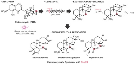 Workflow from natural product discovery to enzyme utility in accessing complex molecules. The example shown illustrates the chronological order of research on platensimycin (PTM), from molecule discovery [29] to biosynthetic gene cluster (BGC) identification [30] to enzyme characterization [31]. This directly enabled the use of an enzyme from this pathway (PtmO6) in the synthesis of the complex natural products mitrekaurenone, pharboside aglycone, and fujenoic acid [32]. Pink dots represent carbons that are functionalized by PtmO6.