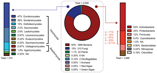 Analysis of the Minimum Information about a Biosynthetic Gene Cluster (MiBIG) repository [33]. The pie chart (center) shows the natural product source for all 2009 BGCs deposited on the MiBIG repository. All 1666 bacterial BGCs are further categorized by phylum (right) and Proteobacteria are further categorized by class. All 310 fungal BGCs are further categorized by phylum and class (left).