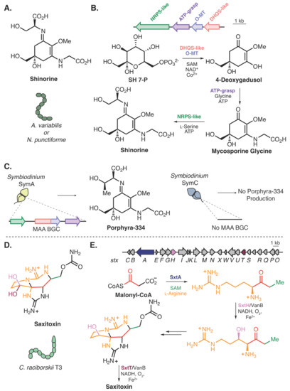 Natural products present in both cyanobacteria and marine eukaryotes. (A) Structure of the mycosporine-like amino acid (MAA) shinorine produced by Anabaena variabilis and Nostoc punctiforme. (B) Biosynthesis and BGC of shinorine from Anabaena variabilis and Nostoc punctiforme [59]. SH 7-P; Sedoheptulose 7-phosphate. (C) The MAA Porphyra-334 is produced in the dinoflagellate Symbiodinium SymA and the BGC was identified, while Symbiodinium SymC does not produce MAAs and no BGC is found within the genome [56]. (D) Structure of saxitoxin produced by Cylindrospermopsis raciborskii T3. (E) The BGC for saxitoxin (stx) and resolved biosynthetic steps [68,69].