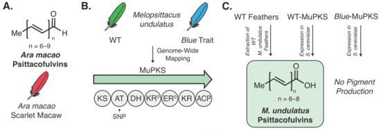 Polyene natural products and their role in pigmentation in birds. (A) Psittacofulvins isolated from the scarlet macaw. (B) WT feathers in Melopsittacus undulatus are green. The blue trait was mapped to a single-nucleotide polymorphism (SNP) located within the MuPKS. (C) Heterologous expression of MuPKS in yeast led to the production of the same polyene pigments found within WT feathers. Heterologous expression of the MuPKS with the blue trait SNP led to no pigment production [104].