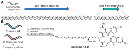 Nemamide biosynthesis in Caenorhabditis elegans. (A) Domain architecture of the Caenorhabditis elegans N2 PKS (pks-1) on chromosome III and the NRPS (nrps-1) on chromosome X. (B) Differential metabolomics approach using both pks-1 and nrps-1 mutated worms against WT worms to identify the nemamide metabolites, which were subsequently isolated and structurally characterized [119].