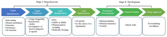 The initial step in the first stage of the drug development process is target identification [7]. To identify the druggable biological molecule responsible for specific disease is an important step followed by functional characterization of the target molecule [45]. The characteristics of a druggable target molecule are safe (non-toxic), efficacious, and meet clinical requirements. Various computational methods like panel docking [46], or data mining/machine learning [47] and experimental techniques such as expression profiling [48], cell-based assays, and functional screening, are available for identification and selection of potent target molecules. Target validation involves confirmation of role of target molecule in the disease and whether its activity can be modulated using a small molecule drug or biologic [49]. Once the potential target molecule is identified, next step is structure determination. 3D structure information of therapeutically important targets is crucial for the development of a potent drug. Many integrated structural biology techniques are available such as cryo-electron microscopy, nuclear magnetic resonance method, and X-ray crystallography but in the absence of solution structure, computational techniques are available. Computational methods include homology modeling, threading, and ab initio modeling. Homology modeling is more reliable approach among in silico methods as it considers the structural information of homologous proteins. The predicted structures are further validated using various validation tools such as Ramachandran plot [7].