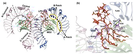 TLR4-MD2-LPS complex (PDB ID: 3FXI). (a) The ECD is divided into three subdomains: N-terminal, central, and C-terminal domains. The evolutionary conserved patches A and B resides in the N-terminal domain and central domain, respectively. (b) Key residues involved in the binding of LPS with TLR4-MD2 complex. TLR4 residue R241 is shown in green color and MD2 residues K58, Y102, S118, S120, K122, and G123 shown in magenta color. LPS is represented by red color.