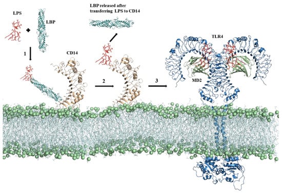 The binding mechanism of LPS for TLR4 activation. A series of events takes place prior to LPS recognition by the TLR4-MD2 complex. (1) LBP extracts LPS from the bacterial membrane and (2) transfers it to membrane anchored CD14, where it binds to the hydrophobic pocket located at the N terminus and forms a monomeric complex. (3) CD14 facilitates LPS transfer to the TLR4-MD2 complex where it initiated the intracellular pathway.