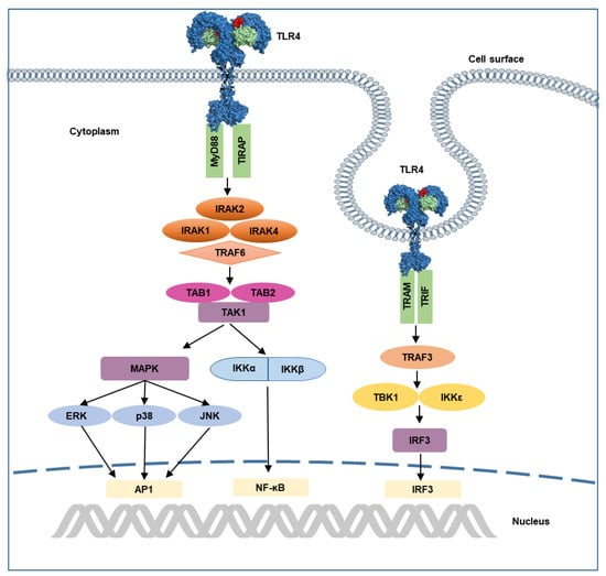 A release of LPS from invading bacteria is an early sign of infection and is capable of inducing a strong immunological response [16]. LPS is composed of three structural components: (I) a conserved hydrophobic lipid A component, (II) a branched hydrophilic core polysaccharide chain, and (III) a hydrophilic repeating oligosaccharide side chain [15]. The engagement of TLR4 by LPS has a complicated mechanism and involves several proteins including LPS-binding protein (LBP), cluster of differentiation 14 (CD14), and MD2. LBP extracts LPS from the bacterial membrane and then transfers it to CD14, which assists with the transfer of LPS to the TLR4–MD2 complex [15,19,20]. Upon LPS recognition, the TLR4–MD2 homo-heterodimer forms that triggers the downstream signaling cascade. This process is schematically presented in Figure 3. TLR4 has a distinctive capability of initiating two signaling cascades: the myeloid differentiation primary response protein 88 (MyD88)-dependent pathway and TIR domain-containing adaptor inducing interferon-β (TRIF)-dependent (MyD88-independent) pathway (Figure 4) [15]. In the former, TLR4-MD2 dimerization at the cell surface recruits adaptor proteins TIR domain-containing adaptor protein (TIRAP) and MyD88. MyD88 interacts with the IL-1R–associated kinase (IRAK) complex, which recruits tumor necrosis factor receptor–associated factor 6 (TRAF-6) [21,22,23]. It promotes the activation of transcription of nuclear factor-κB (NF-ĸB) genes and proinflammatory cytokines tumor necrosis factor-α (TNF-α) and interleukin-6 (IL-6) [24,25,26]. Endocytosis of TLR4-MD2 complex activates the MyD88-independent pathway in the endosomal compartment [27]. Instead of TIRAP, TRIF-related adaptor molecule (TRAM) recruits TRIF and switches TRAF3 on. TRAF3 is responsible for downstream induction of TANK-binding kinase 1 (TBK1) and IKKε leading to the activation of transcription factor IRF3 and type I interferon [28,29]. The MyD88-independent pathway stimulates the late-phase induction of a mitogen-activated protein kinase (MAPK) and NF-ĸB [30].