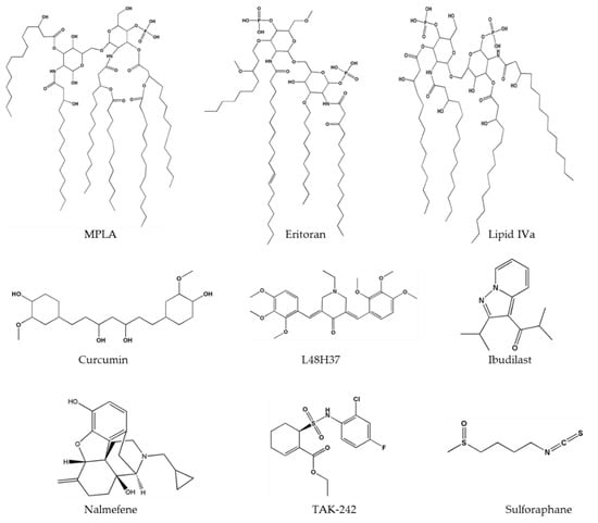 The inhibition of TLR4 by a small-molecule can be achieved by blocking (1) ligand-receptor interaction, (2) dimerization of the TLR4-MD2 complex, or (3) downstream signaling. Small-molecule antagonist TAK-242 (resatorvid) (Figure 5), a cyclohexane derivative binds to Cys747 in the intracellular domain of TLR4 and inhibits its interaction with adaptor molecules [91]. A cyclohexane ring present in TAK-242 interacts with the −SH2 group of cysteine of TIR domain. Nonetheless, this compound failed in phase III clinical trials because it did not lower the IL-6 level in sepsis or respiratory failure [92]. Various studies have shown that curcumin has anti-inflammatory properties and downregulates pro-inflammatory cytokines such as IL-1, -2, -6, -8, and TNF-α as well as MAPKs [93]. Curcumin (Figure 5) can inhibit both pathways of TLR4 i.e., MyD88 dependent and TRIF dependent [94]—and can fit into the MD2 pocket as confirmed by experimental and computational studies [95,96,97]. To enhance the stability of curcumin, its analogs have been synthesized, and among these analogs, L48H37 (Figure 5) features greater chemical stability and enhanced anti-inflammatory properties [98]. These compounds contain a conserved group 3-(4-hydroxyphenyl) acrylaldehyde, which directly binds to the MD2 pocket and blocks the LPS binding. Therapeutic applications of curcumin in a wide range of inflammatory diseases have been reported [99]; the same is true for metabolic syndrome [100], type II diabetes mellitus [101], systemic lupus erythematosus [102], melanoma [103], pulmonary diseases, and lung cancer [104]. Another well-known plant-derived inhibitor of TLR4 is sulforaphane (Figure 5), which inhibits TLR4 dimerization and has an anti-inflammatory effect [105]. It has been reported that sulforaphane inhibits LPS-induced secretion of cyclooxygenase 2, TNF-α, HMGB1, and inducible NO synthase in macrophages [106,107]. Sulforaphane binds to the cysteine residue located in the MD2 pocket at position 133, which performs an important function in the MD2-LPS interaction. Sulforaphane occupies the binding pocket and as a result disrupts the binding of LPS to the TLR4-MD2 complex [108].