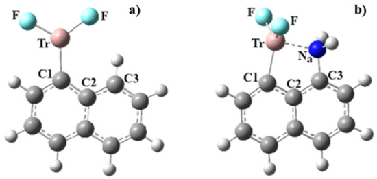 The geometries of the naphthalene derivatives C10H7TrF2 and C10H6NH2TrF2 (Tr = B, Al, Ga, In, Tl) and their complexes with HCN and CN− were all optimized at the MP2 level of theory in combination with the aug-cc-pVDZ basis set [88,89]. For the purpose of including relativistic effects for heavy In and Tl atoms, aug-cc-pVDZ-PP pseudopotentials were incorporated [90,91,92,93,94,95]. Frequency calculations were carried out at the same level to verify that the obtained geometries are true minima with no imaginary frequencies. The energies were recalculated at the CCSD(T)/aug-cc-pVDZ level (making use of MP2 geometries) to verify their accuracy [96,97,98]. The interaction energy (Eint) is defined here as the difference between the energy of the complex and the sum of monomers, with the latter in the geometry they adopt within the complex. The binding energy (Eb) takes as its reference the optimized pre-deformed isolated monomers. Thus, the difference between interaction and binding energy is the deformation energy Edef. All energies were corrected for basis set superposition error (BSSE) via the counterpoise protocol [99]. Computations were performed using the Gaussian 16 suite of codes [100].