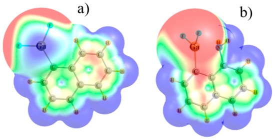 MEPs of (a) C10H7GaF2 and (b) C10H6NH2GaF2. Blue and red regions refer, respectively, to +0.02 and −0.02 au.