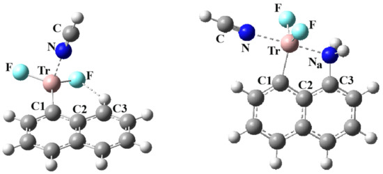 As was the case for the neutral ligands, the complexes of the unsubstituted naphthalenes with NC− are also stabilized by a sole intermolecular Tr···C bond, within the AIM context, as may be seen in Figure S2. Consistent with the HCN situation, there are additional secondary interactions for C10H6NH2TrF2. This noncovalent bond occurs only for the three lightest Tr atoms, and can be characterized as a very weak CH···C HB. It is interesting to observe that, in the case of the strong CN− Lewis base, there is evidence that the internal Tr···B bond weakens to the point of vanishing, as may be seen by the lack of a pertinent bond path in Figure S2, which is replaced in certain cases by one or more NH···F HBs. This internal bond weakening/disappearance explains the lack of bending of the Tr and Na atoms toward one another, alluded to above.