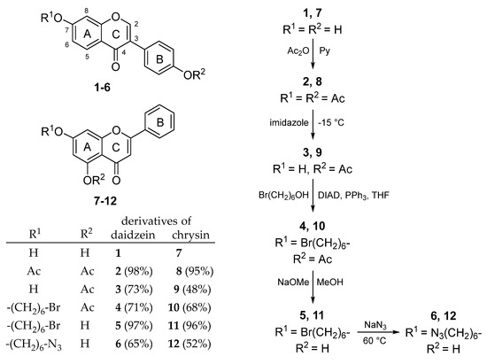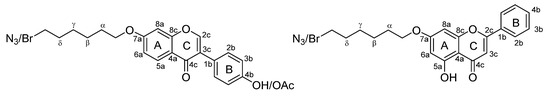 The isoflavone daidzein (1) and the flavone chrysin (7) were the molecules of choice for the preparation of 7-azidohexyl ether derivatives in five steps (Figure 1). The flavonoids (1,7) were acetylated by acetic anhydride in pyridine, and their position 7 were selectively deprotected using imidazole [29]. A bromohexyl moiety was introduced in position 7 by the Mitsonobu reaction, and after complete deacetylation, an azide substitution was applied.