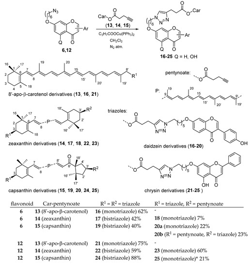 Coupling of 7-azidohexyl ethers of daidzein and chrysin with carotenoid pentynoates by azide-alkyne click-reaction. * In compound 25, the R1 and R2 groups are interchangeable.