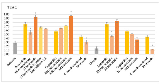 TEAC values of the parent flavonoids and carotenoids, as well as those of their conjugates. The error bars show the standard deviation. * indicates significant differences compared to the parent carotenoid (p < 0.05).