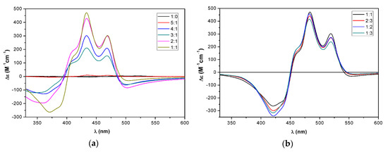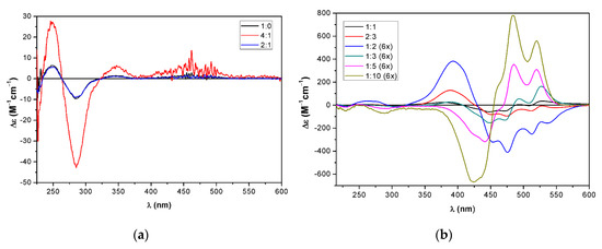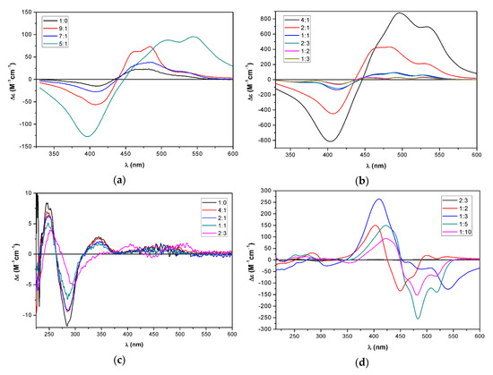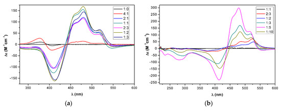 The ECD transitions above 400 nm reached the maximum intensities at the 1:1 ratio and there was no significant decrease in the intensity up to the 1:3 ratio.