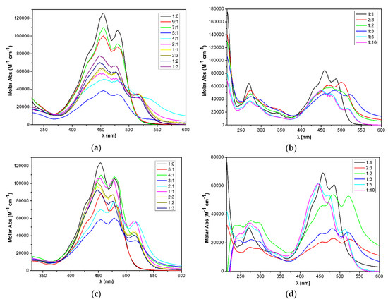 UV-vis spectra of chrysin–zeaxanthin conjugates of (a) the bistriazole 22 in acetone/water 1:0–1:3; (b) bistriazole 22 in THF/water 1:1–1:10; (c) monotriazole 23 in acetone/water 1:0–1:3; (d) monotriazole 23 in THF/water 1:0–1:1.