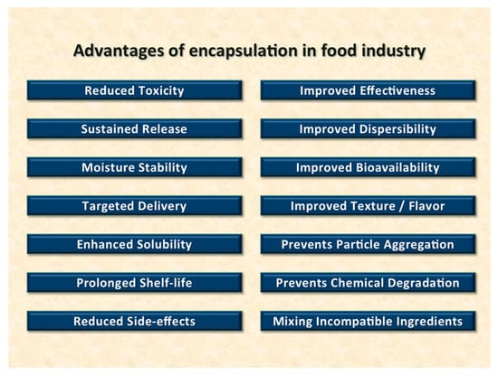 Encapsulation and/or entrapment of bioactive compounds is a process in which small solid particles, or droplets of liquids or gases, are separated from other particles and from the external medium using a thin film or a vesicular system [1,2]. This process can mainly be physical (e.g., encapsulation or entrapment by colloidal carriers), chemical (e.g., by chemical conjugation of active material to the carrier molecules) or electrostatic adsorption to the surface of metal particles [1,2]. A wide range of coating materials can be employed in the field of food and nutraceuticals. These include celluloses, gums, lipids, phospholipids and proteins [3,4]. Depending on the carrier material and the process method used, encapsulation may provide several advantages to the encapsulated compounds and the finished product as well. Some of these advantages and benefits are listed in Figure 1.