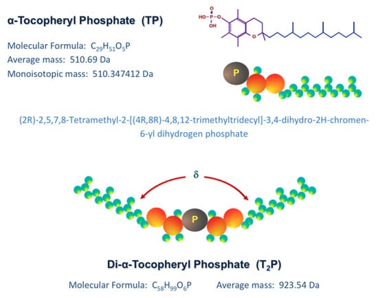 Chemical structure of alpha tocopheryl phosphate (TP) and di-alpha tocopheryl phosphate (T2P). The angle of alignment of hydrocarbon chains (phytyl tails) of T2P molecule (δ) results in an “inverted truncated cone” molecule with a critical packing parameter (cpp) of greater than 1.
