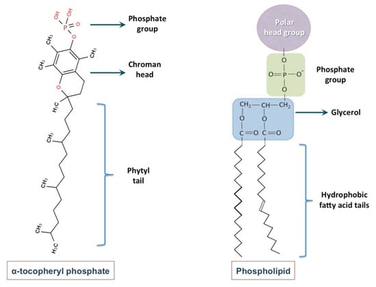 Comparison of the chemical structure of a tocopheryl phosphate molecule with a phospholipid molecule. A phospholipid molecule is composed a phosphate group, 2 fatty acid tails and a glycerol linker. However, alpha-tocopheryl phosphate consists of a chroman head (with two rings: one phenolic and one heterocyclic) and a phytyl tail with 3 isoprene side-chains.