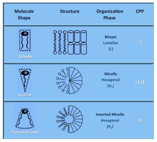 Schematic diagram of the effect of molecular shape on the structure of the three main types of amphiphilic aggregates. CPP: critical packing parameter (adapted with modifications from Kulkarni 2016; Lasic 1998).