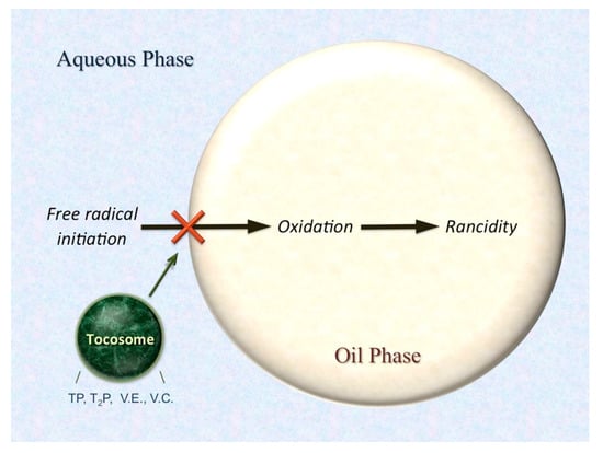 Liposome-entrapped α-tocopherol has been shown to be more effective at preventing oxidation in oil-in-water emulsions than when it is in the free form and dissolved in the oil phase of the emulsion [72]. It is known that oxidation occurs first at the water/oil interface. If the nanoliposome/tocosome is situated at this interface, the α-tocopherol in the membrane could reduce the peroxy radicals before these radicals initiate oxidation (Figure 5). Ascorbic acid entrapped in the aqueous phase of the carrier system could regenerate the α-tocopherol. Encapsulation of the ascorbic acid would minimize the degradation of this molecule by other food components and ensure maximum α-tocopherol regeneration.