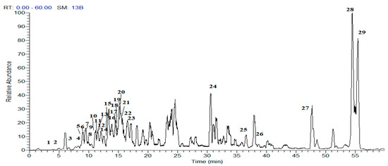 A comprehensive metabolic profiling of the EP-MF was performed using HPLC-PDA-ESI-MS/MS. Chromatograms were acquired in both negative and positive ion modes (Figure 1). A total of 29 peaks were detected, of which 25 metabolites were tentatively identified based on their UV spectra as well as MS/MS data given by the mass of the molecular ion peak and their fragments, considering the neutral mass loss and known fragmentation patterns as well as comparison with the available literature. A list of identified peaks together with their chromatographic and spectroscopic data is presented in Table 1. The identified compounds belonged to various classes, including organic acids, phenolic acids, flavonoids and fatty acids.