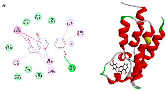 Bromodomains have attracted serious interest over the past few years as promising new epigenetic targets for diverse human diseases as cancer. PB1 protein is considered a critical factor for tumor progression [22]. The inhibitory activity of the identified metabolites from our extract to the PB1 protein was evaluated using in silico molecular docking. The crystal structure of luteolin extracted from PB-1 was superimposed to the docked pose and agreed well with the conformation obtained, leading to an RMSD value between the calculated pose and the crystal structure of 1.9445.