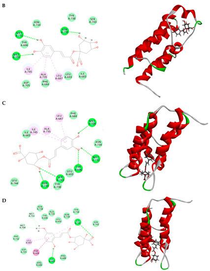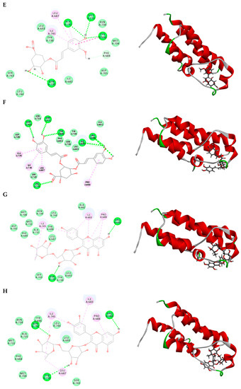 2D and 3D ligand−enzyme interactions of high score compounds: (A) Luteolin (LU2), the co-crystallized inhibitor; (B) 1-O-Caffeoyl quinic acid (7); (C) 4-O-Caffeoyl quinic acid (8); (D) 3-Feruloyl quinic acid (10); (E) 5-Feruloyl quinic acid (12); (F) 3,4-Dicaffeoyl quinic acid (17); (G) Kaempferol-O-rutinoside (18); (H) Rutin (20); (I) Quercetin-O-hexoside (21); (J) Isorhamnetin-O-rutinoside (22); with PB1 (PDB ID: 5II2). Residues are annotated with three-letter amino acid code and their position. Polar residues are coloured green; hydrophobic residues are coloured purple, Hydrogen-bonding interactions are represented with a green dashed line between the receptor and the ligand while π–alkyl interactions are represented with a purple dashed line.