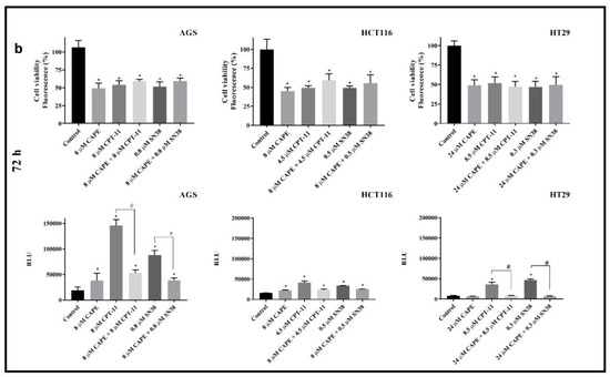 Viability and caspase-3/7 activity after 24 h (a) and 72 h (b) of exposure on CAPE, CPT-11, CAPE + CPT-11, SN38 and CAPE + SN38 in AGS, HCT116 and HT29 cell line (mean ± S.E.M). * p < 0.05 as compared with control (untreated) cells; # p < 0.05 as compared with cells treated drug.